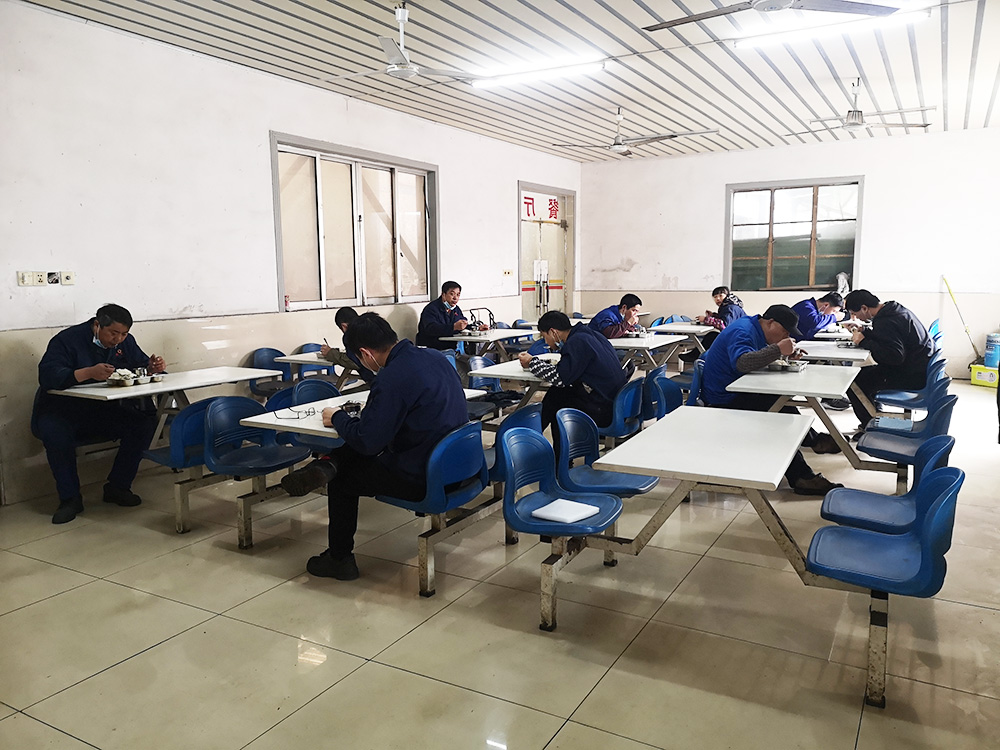 食堂采用分批分餐制,全新的餐具分別激光打上編號,一人一號,報號取餐,餐具集中消毒清洗,讓全體員工安心復(fù)工,放心用餐。
