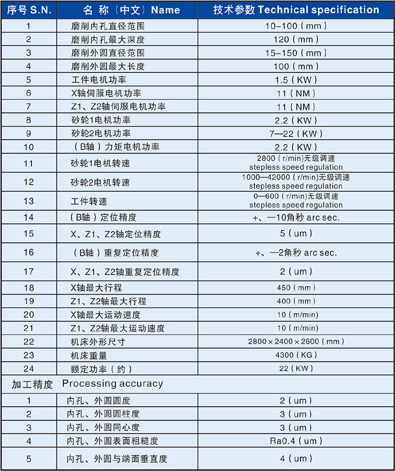 ● 本機(jī)床為四軸(X工件橫向進(jìn)給、Z1、Z2砂輪縱向運(yùn)動、B水平方向分度)多功能數(shù)控磨床,主要用于磨削工件的內(nèi)圓孔、內(nèi)錐孔、內(nèi)端面、外圓、外錐面、外端面、內(nèi)、外球形等復(fù)雜要求的磨削。磨削循環(huán)均自動完成(具有自動進(jìn)刀、退刀、粗磨、精磨;自動修正砂輪、自動補(bǔ)償?shù)裙δ?。● 機(jī)床采用工件進(jìn)給,B分度(力矩轉(zhuǎn)臺),二獨(dú)立工作臺(砂輪架)左右運(yùn)動的結(jié)構(gòu)方式,X、Z軸運(yùn)動導(dǎo)軌均為滾動直線導(dǎo)軌,均由伺服電機(jī)驅(qū)動滾珠絲杠運(yùn)動,工件主軸及砂輪主軸旋轉(zhuǎn)速度均由變頻器控制,實(shí)現(xiàn)無級調(diào)速。工件夾緊為液壓動力卡盤,同時可以根據(jù)用戶工件的特殊性配置其它相匹配的夾具